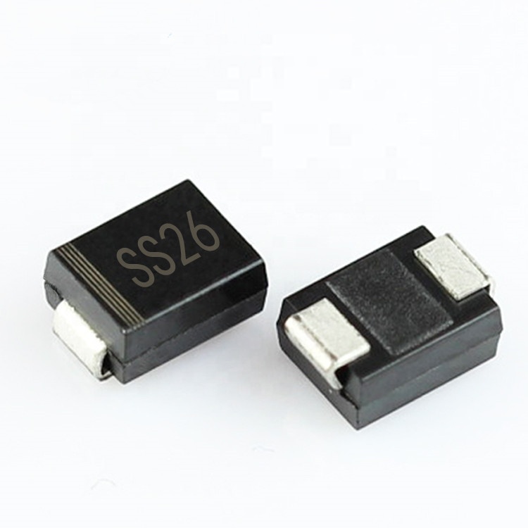 Diodo rectificador schottky SS26 para montaje en superficie, es el equivalente al SR260 DO-41 para montaje a través de agujero THT.