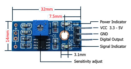 Cuando no existen señales de vibración, este pequeño módulo se encarga de dar a conocer esto mediante un indicador LED de estado bajo y alto, según correspondiera; se caracteriza por tener una única señal de salida digital que puede ser tratada mediante un dispositivo externo, como un microcontrolador, así se puede llevar a cabo una función específica.