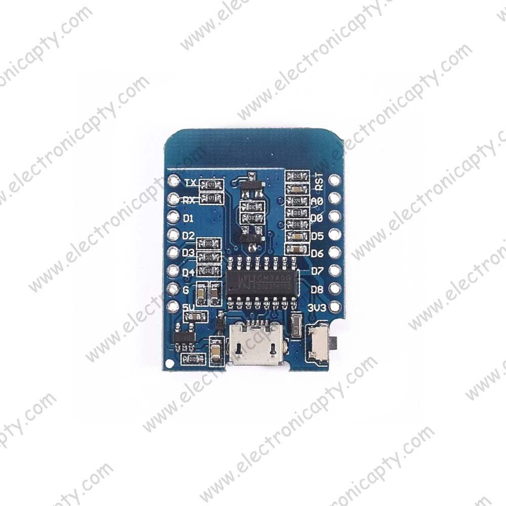Wemos está diseñado especialmente para trabajar en protoboard o soldado sobre una placa. Posee un regulador de voltaje en placa que le permite alimentarse directamente del puerto USB. Los pines de entradas/salidas trabajan a 3.3V. El chip CH340G se encarga de la comunicación USB-Serial.